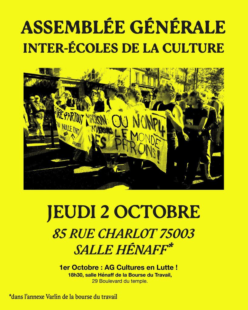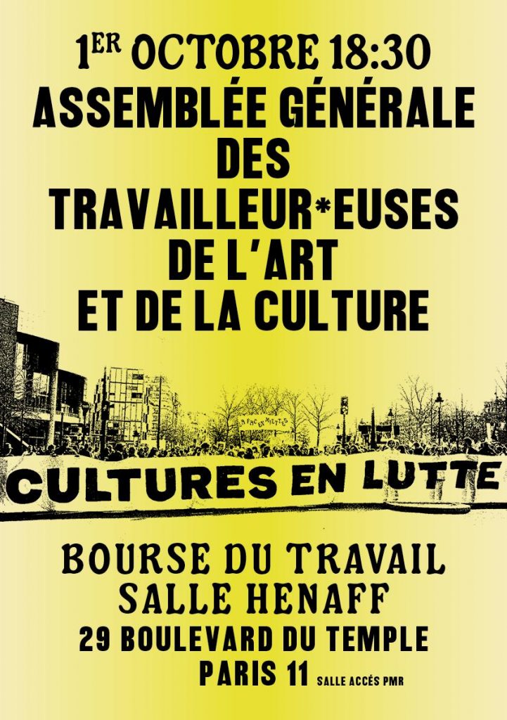 Ce lundi 8 septembre se réunit une AG de Cultures en lutte à la bourse du travail de Paris – Salle Hénaff.